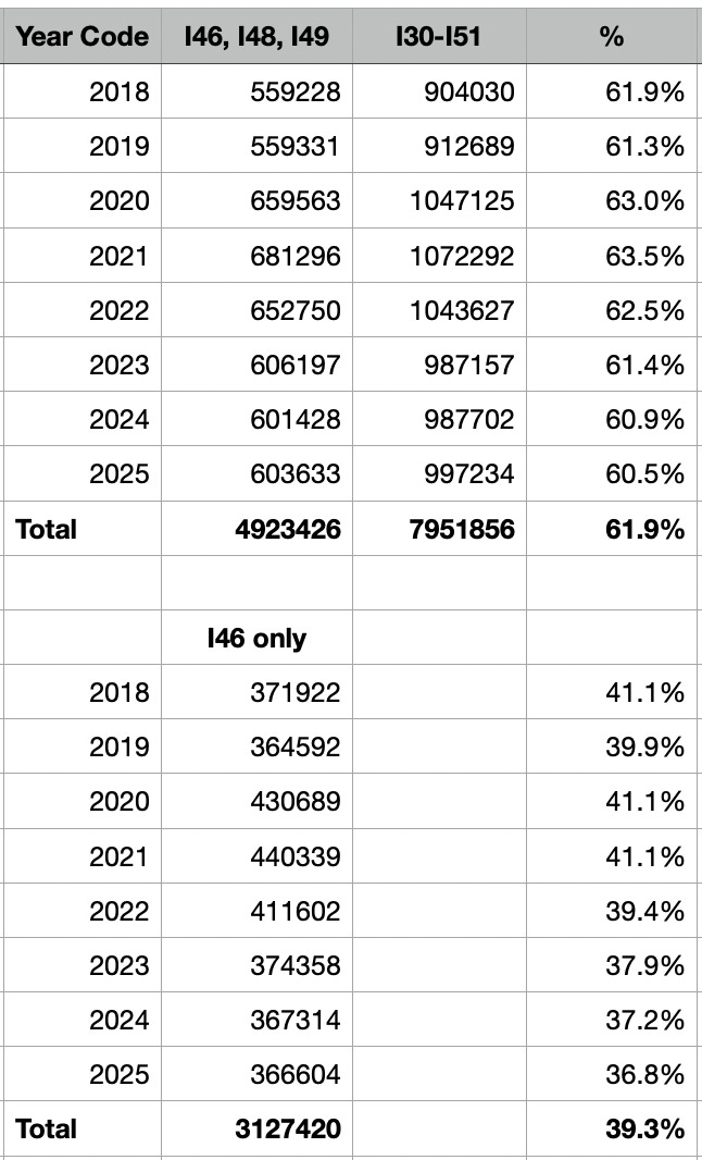 The I46 prefix means, “Cardiac arrest,” and was used on 3,127,420 death records in the United States in years 2018-2025. That is, the entire cardiac code base of prefixes I30-I51 is dominated by the single code prefix, I46, at the rate of 39.3%. Remember that “cardiac arrest” has no useful meaning in context of cause of death and should not be counted in the cardiac disease category.