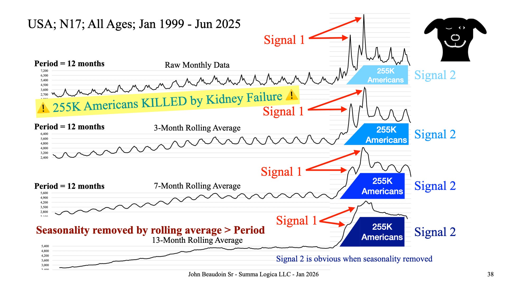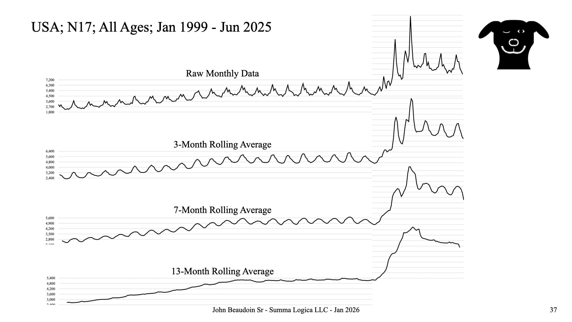 Signal 1 is almost gone in the 13-month rolling average, or I should say that it is not noticeable as to what it really is. The area under the graph still is the same in each plot, but the shape is muted. The area under the graphs is the total number of people who died.